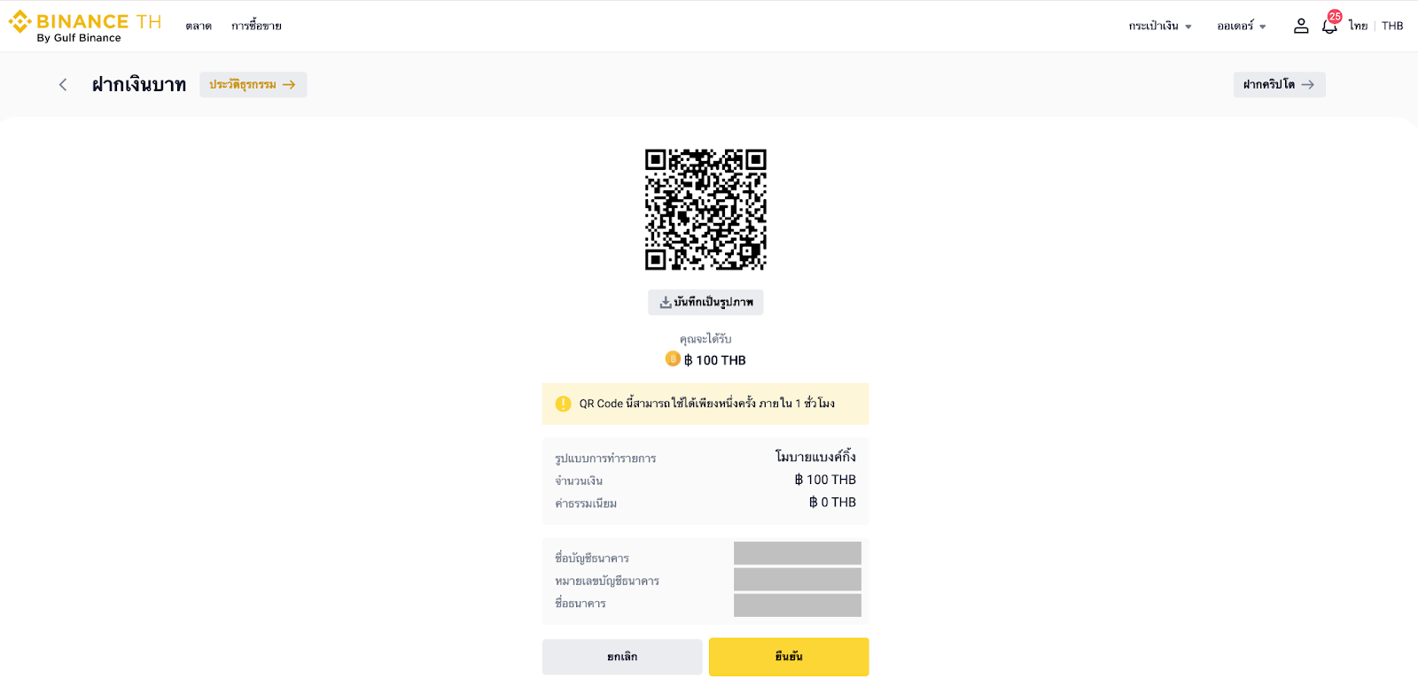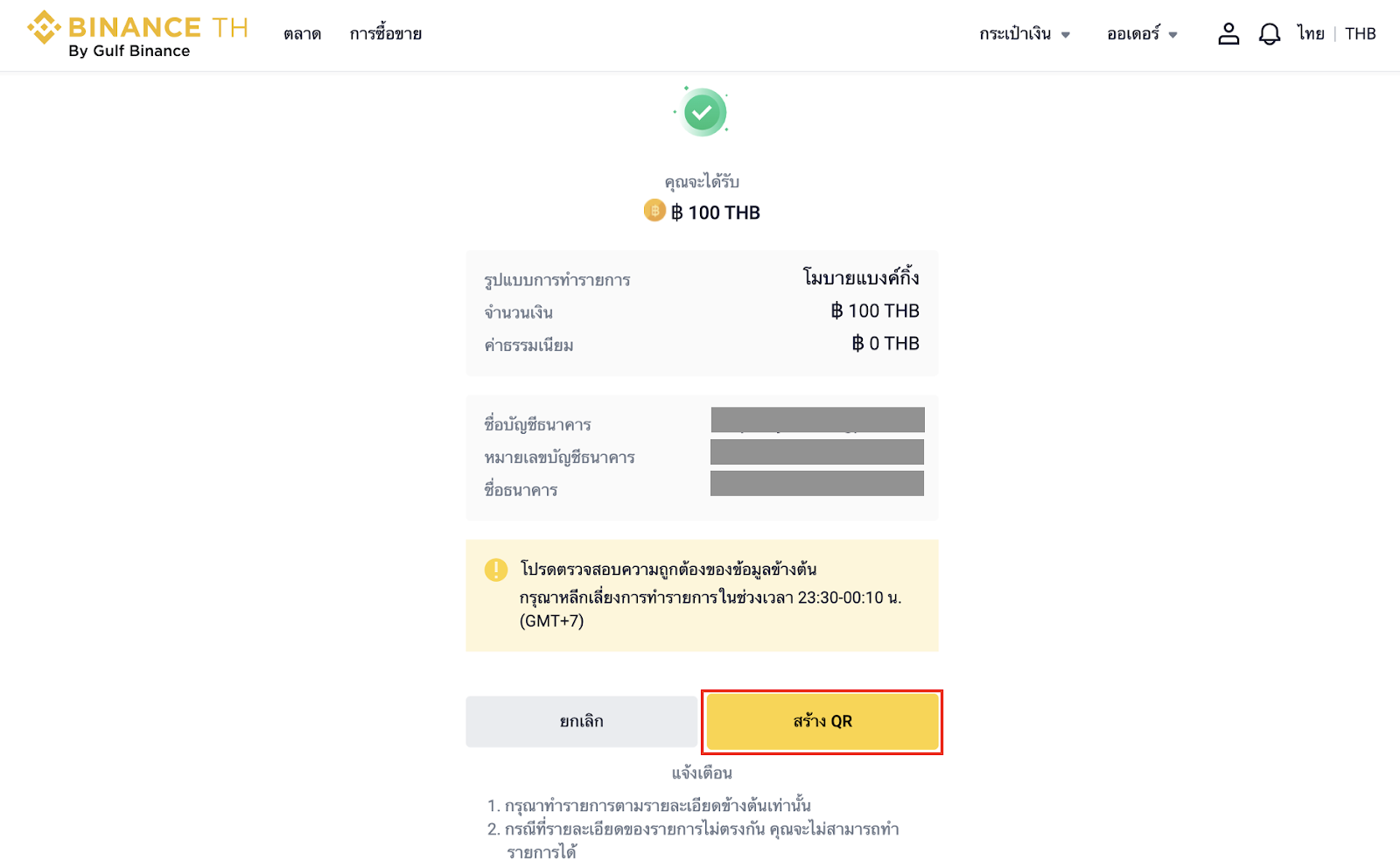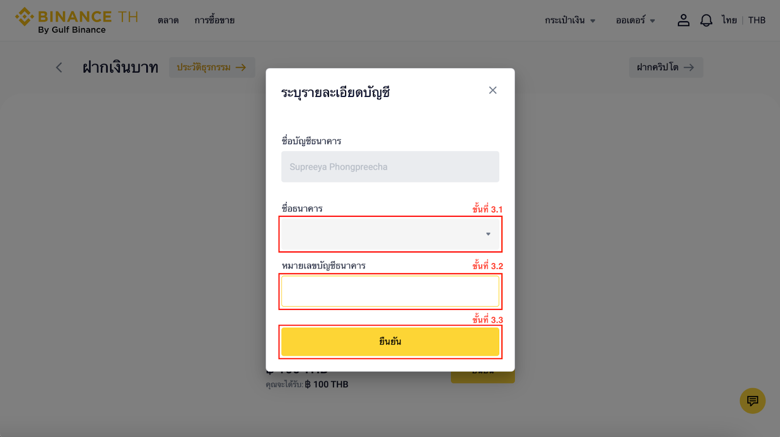 หมายเหตุ: ชื่อ-นามสกุลในบัญชี BINANCE TH ของคุณต้องตรงกับชื่อ-นามสกุลของบัญชีธนาคารที่คุณเลือก คุณจะได้รับเงินในบัญชี BINANCE TH ภายใน 1 นาทีถึง 24 ชั่วโมง