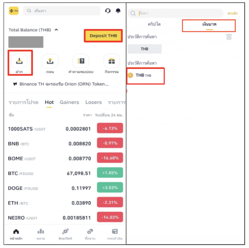 1. เข้าสู่ระบบบัญชี BINANCE TH ของคุณ คลิก [ฝาก] - [ฝากเงินบาท] บนเว็บไซต์ และ [เงินบาท] - [THB] บนแอปพลิเคชัน
