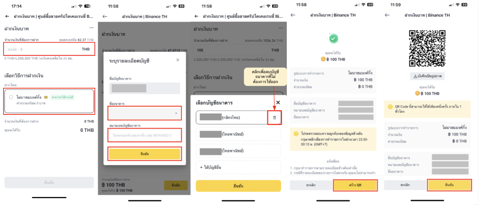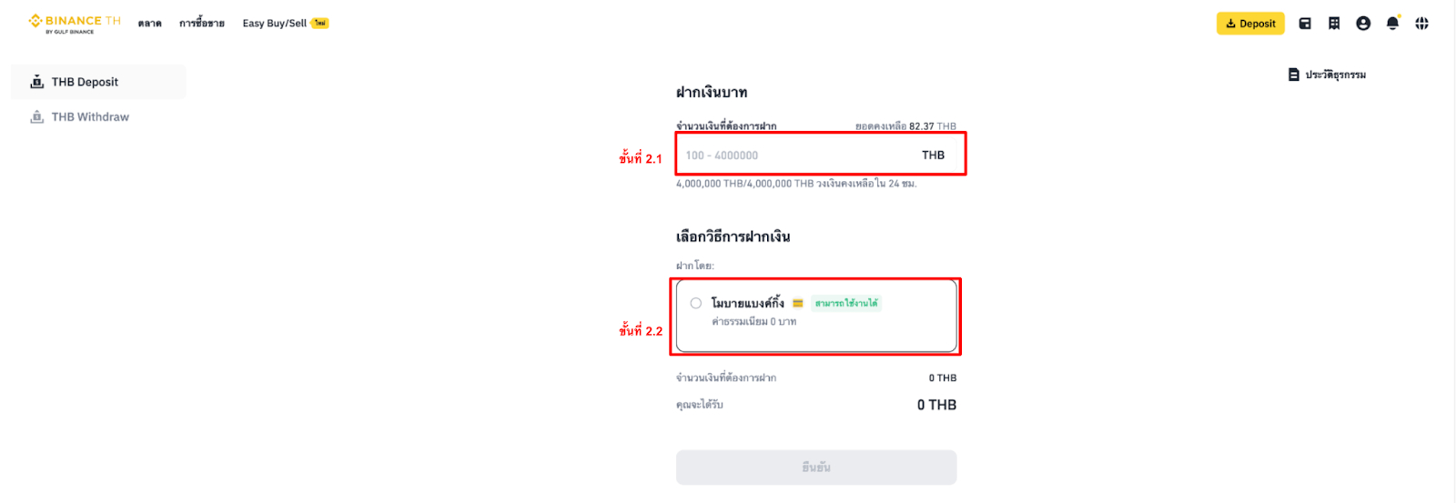 หมายเหตุ: จำนวนฝากขั้นต่ำ 100 บาทต่อครั้ง สูงสุด 4,000,000 บาทต่อครั้ง และมีวงเงินในการฝากเงินสูงสุด 4,000,000 บาทใน 24 ชั่วโมง (คุณสามารถยื่นคำขอเพื่อเพิ่มวงเงินในการฝากถอนเงินบาทต่อ 24 ชั่วโมงได้ โดยกรุณาติดต่อฝ่ายบริการลูกค้าผ่านช่องทางแชทที่ https://www.binance.th/th เพื่ออัปเกรดระดับการยืนยันตัวตนของคุณ)