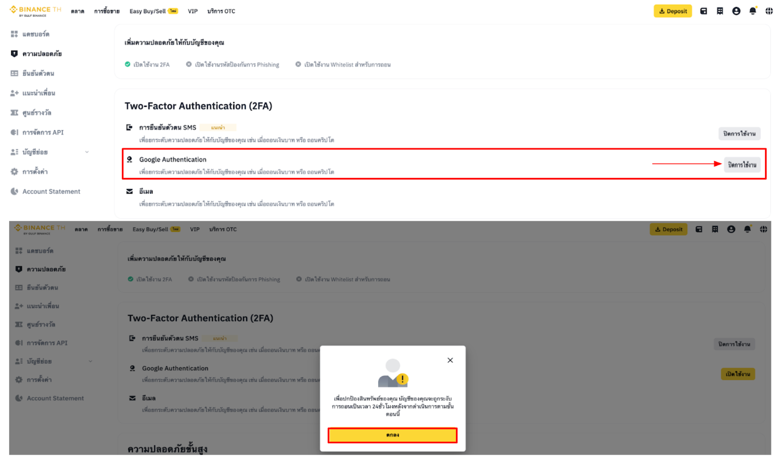 1. เข้าสู่ระบบบัญชี BINANCE TH ของคุณ คลิกที่ไอคอน [โปรไฟล์] > [ความปลอดภัย] และเลือก [Google Authentication] และเลื่อนสไลด์เพื่อปิดการใช้งาน จากนั้นกรุณาอ่านข้อความแจ้งเตือนก่อนกด [ตกลง] ทั้งนี้ เพื่อความปลอดภัยของบัญชีของคุณ คุณจะไม่สามารถถอนสินทรัพย์ได้ชั่วคราวเป็นเวลา 24 ชั่วโมงหลังจากที่คุณเปลี่ยนแปลงการยืนยันตัวตน