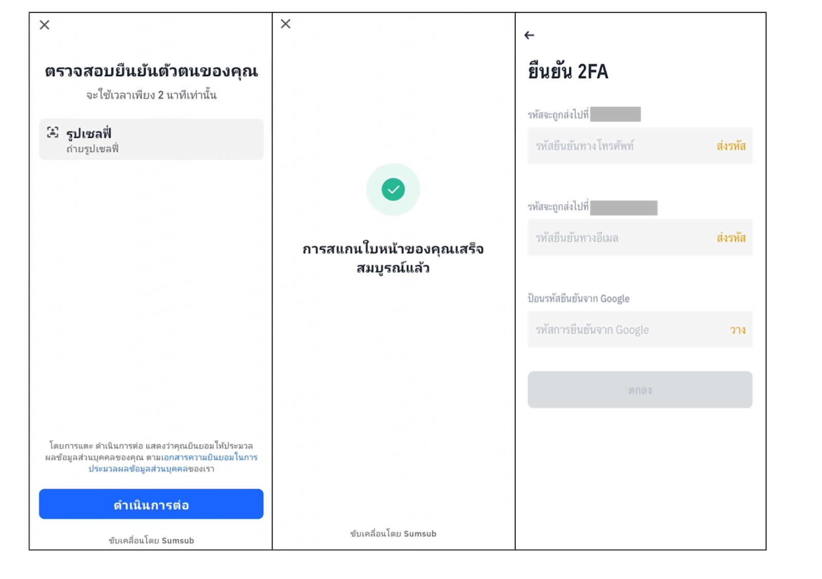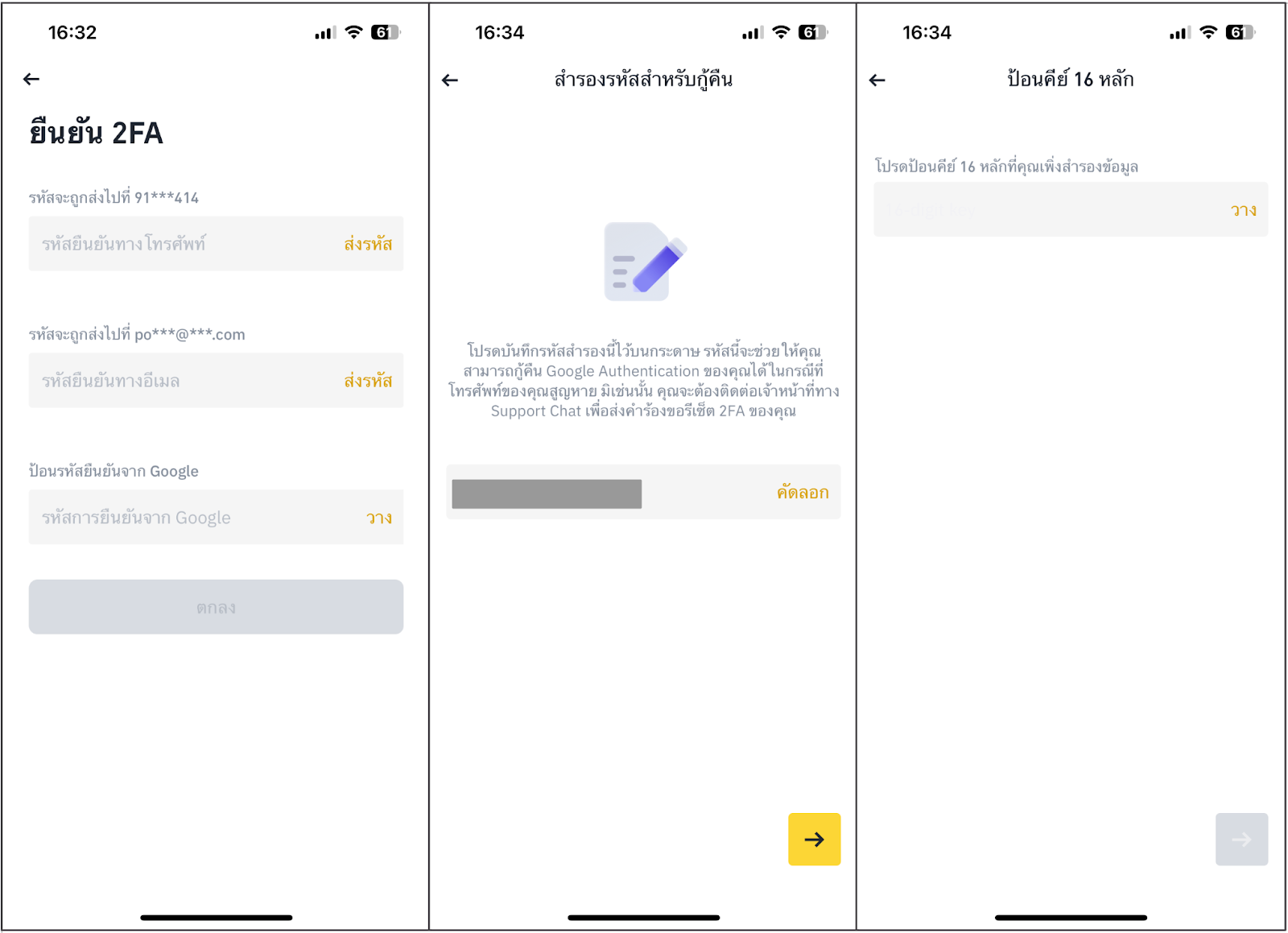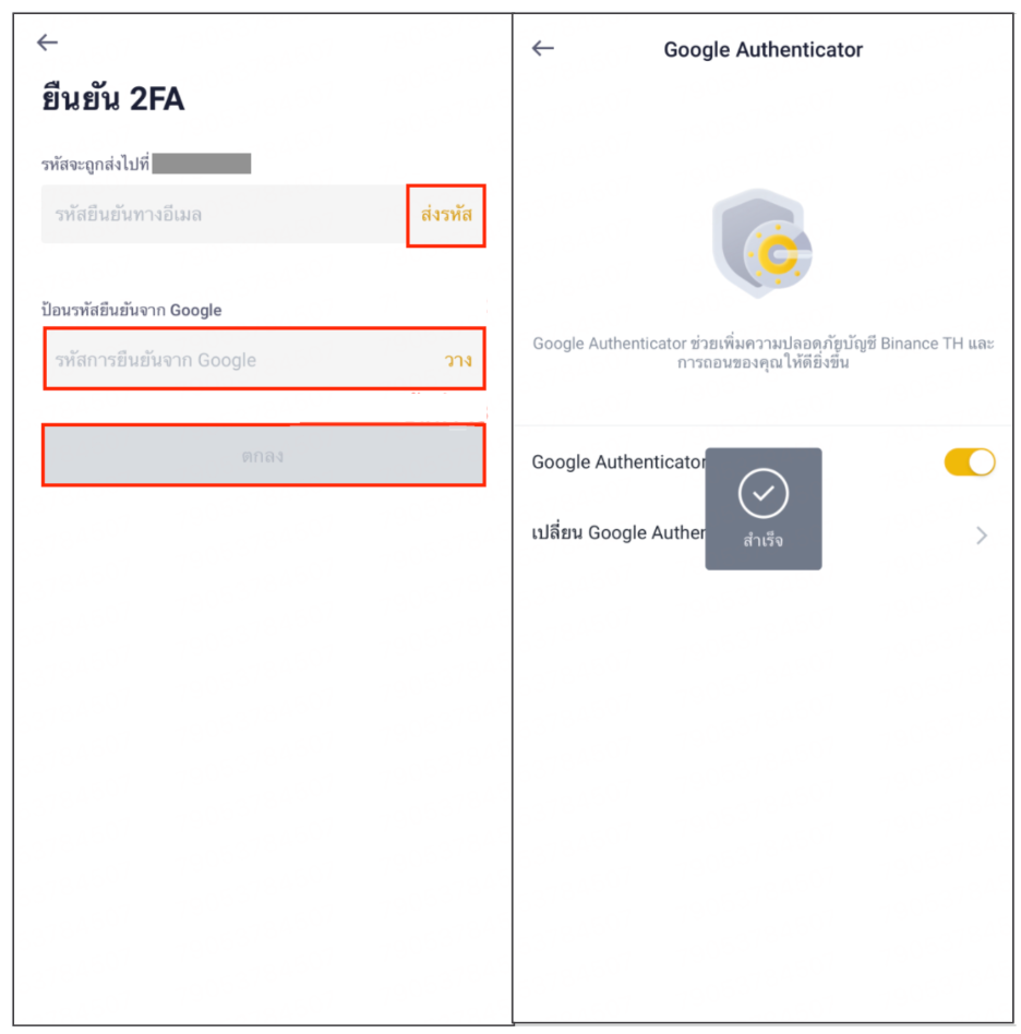 6. ดำเนินการต่อบนแอปพลิเคชัน BINANCE TH คลิกที่ [รับรหัส] ของทุกวิธีการยืนยันตัวตนที่คุณเลือกเปิดใช้งาน กรอกรหัสการยืนยัน 6 หลักที่คุณได้รับ จากอีเมล หรือ SMS หรือ Google Authenticator ใหม่ของคุณ และกด [ตกลง]