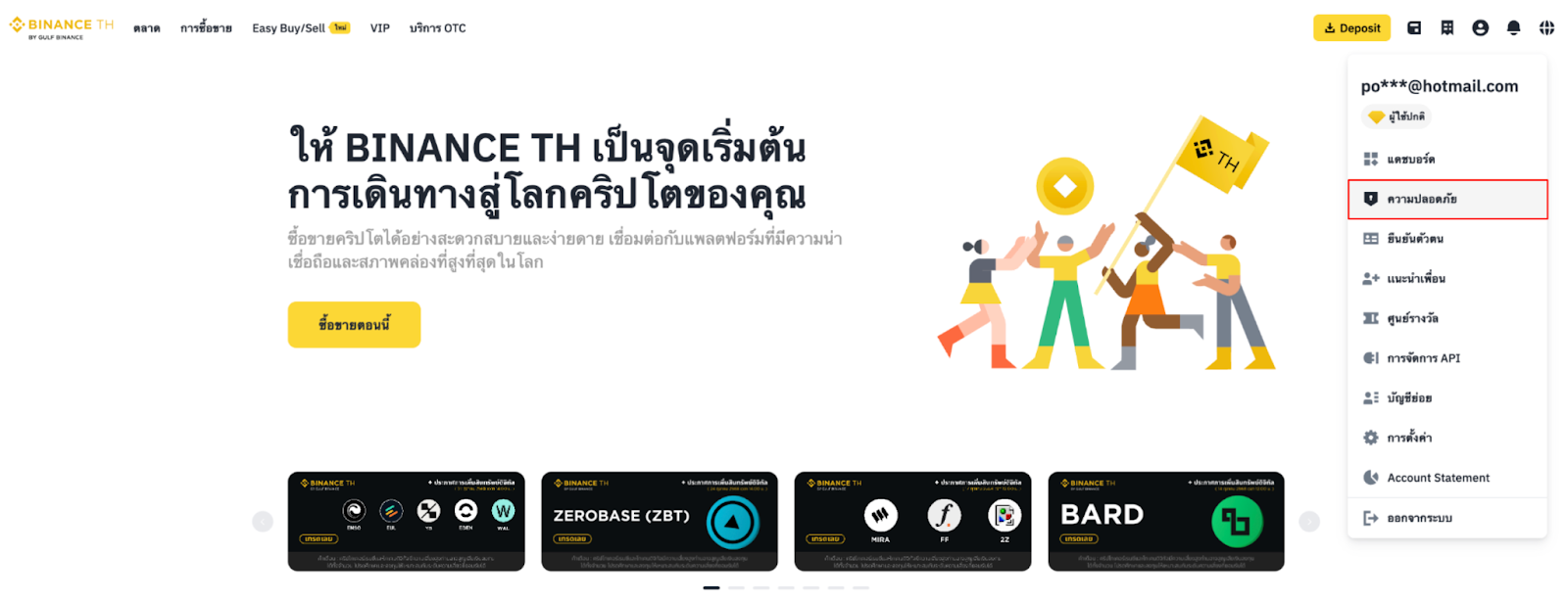 1. เข้าสู่ระบบบัญชี BINANCE TH ของคุณ คลิกที่ไอคอน [โปรไฟล์] > [ความปลอดภัย] บนเว็บไซต์