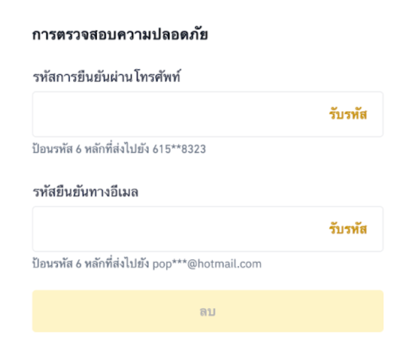 4. คลิกที่ [รับรหัส] ของทุกวิธีการยืนยันตัวตนที่คุณเลือกเปิดใช้งาน กรอกรหัสการยืนยัน 6 หลักที่คุณได้รับ จากอีเมล หรือ SMS หรือ Google Authenticator และกด [ลบ] เพื่อยืนยันความปลอดภัย