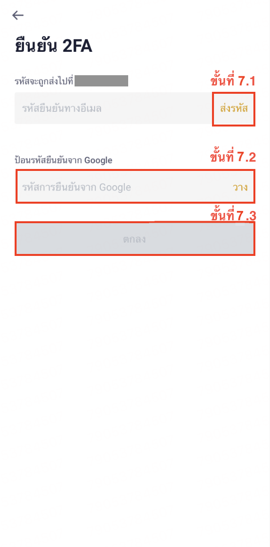 7. ดำเนินการต่อบนแอปพลิเคชัน BINANCE TH คลิกที่ [รับรหัส] ของทุกวิธีการยืนยันตัวตนที่คุณเลือกเปิดใช้งาน กรอกรหัสการยืนยัน 6 หลักที่คุณได้รับ จากอีเมล หรือ SMS หรือ Google Authenticator ใหม่ของคุณ และกด [ตกลง]