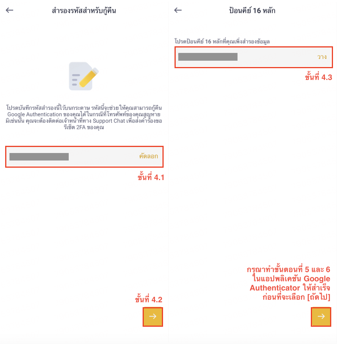 คลิกที่ [วาง] เพื่อวางรหัส 16 หลักในหน้าถัดไป กรุณาทำขั้นตอนที่ 5 และ 6 ในแอปพลิเคชัน Google Authenticator ของคุณให้สำเร็จ จากนั้นกดที่ไอคอน [ถัดไป]