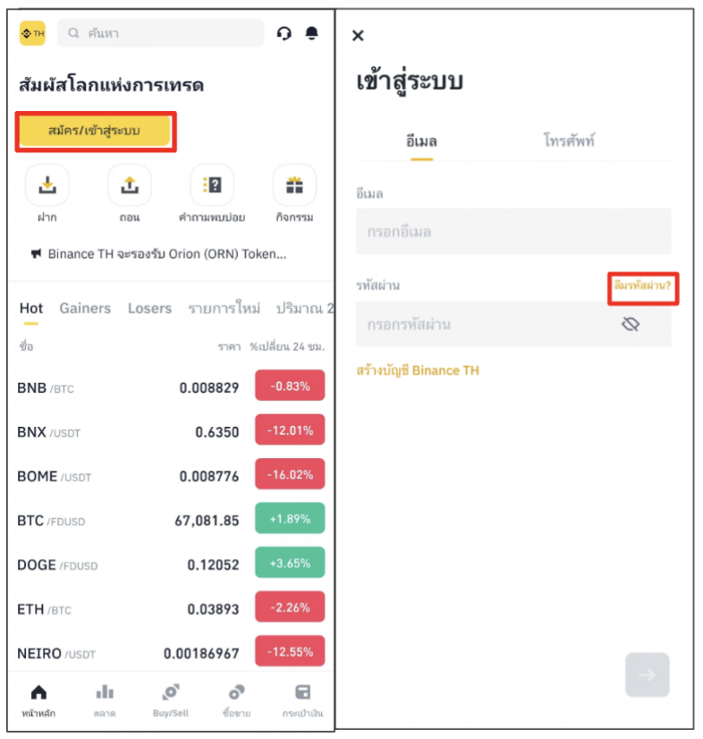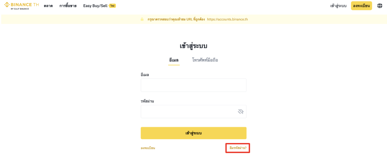 1. ไปที่ Binance TH แล้วคลิกปุ่ม [เข้าสู่ระบบ / ลงทะเบียน] จากนั้นจึงคลิก [ลืมรหัสผ่าน]