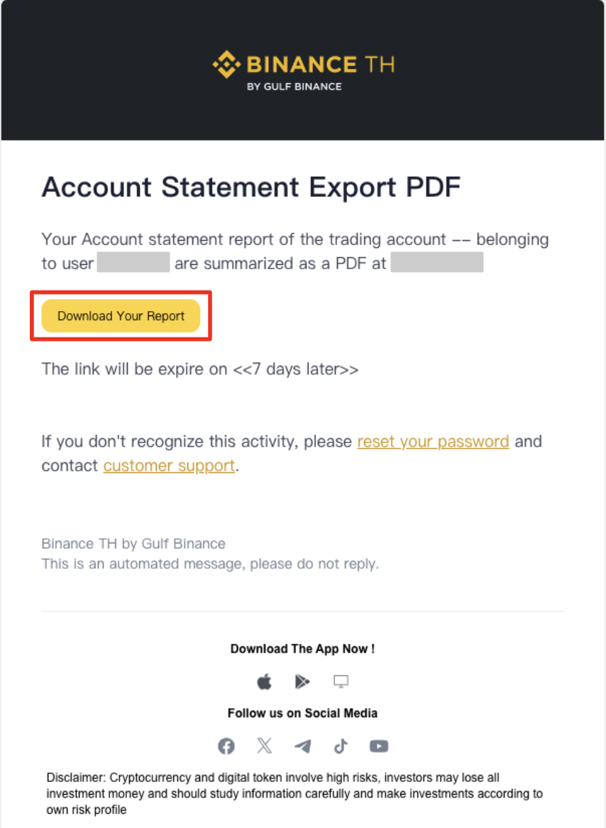 หมายเหตุ: ลิงก์ดาวน์โหลดจะสามารถใช้งานได้เป็นระยะเวลา 7 วัน หลังจากนั้นจะไม่สามารถดาวน์โหลดได้อีก คุณจะต้องทำการส่งออกไฟล์ใหม่จาก Account Statement อีกครั้ง