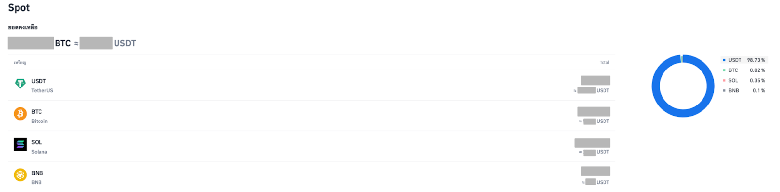 ยอดคงเหลือของสินทรัพย์ในกระเป๋าเงินของคุณ จะแสดงเป็นสกุลเงินบาท (THB) หรือ USDT