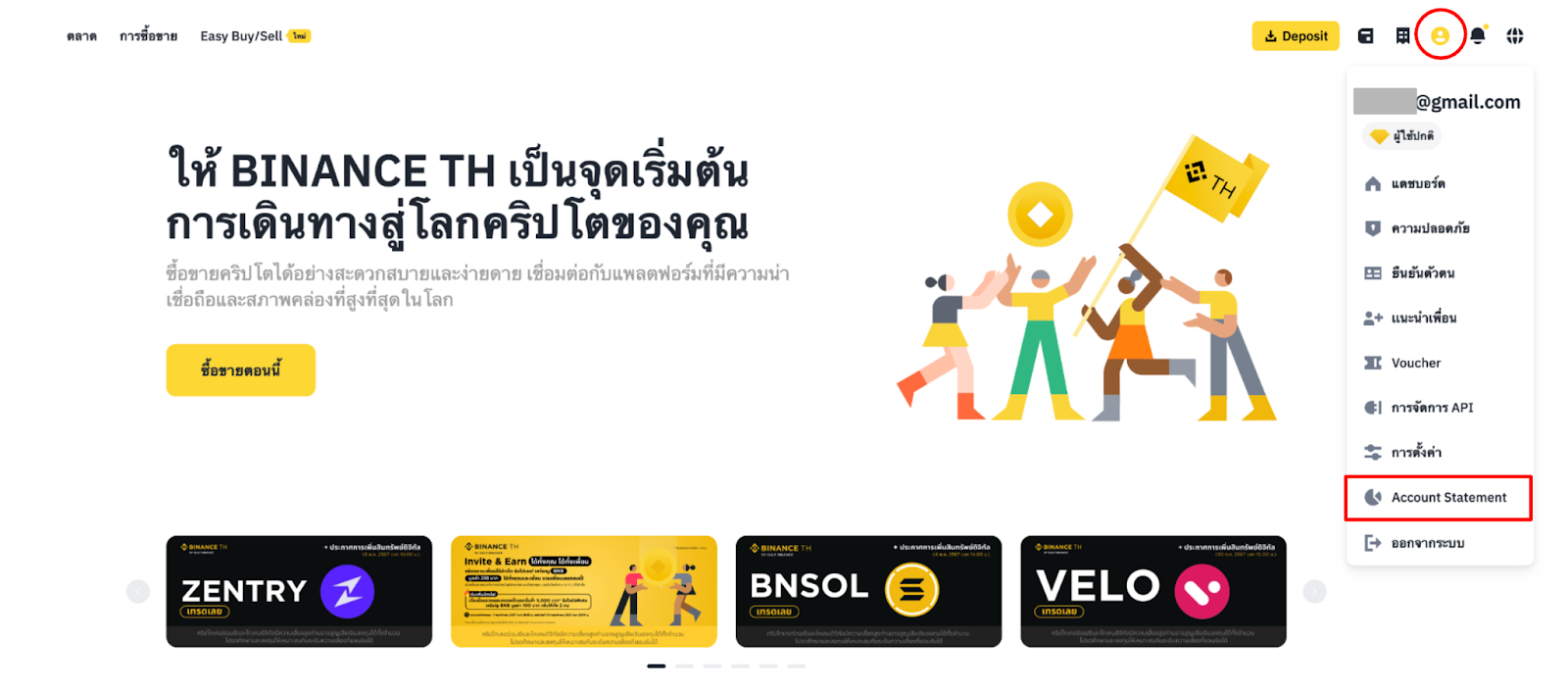 เข้าสู่ระบบบัญชี BINANCE TH ของคุณและคลิก [โปรไฟล์] - [Account Statement]