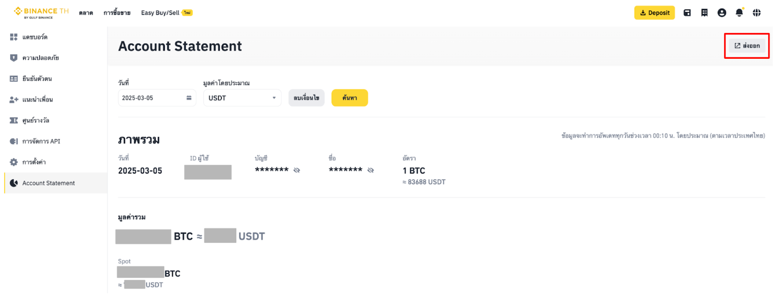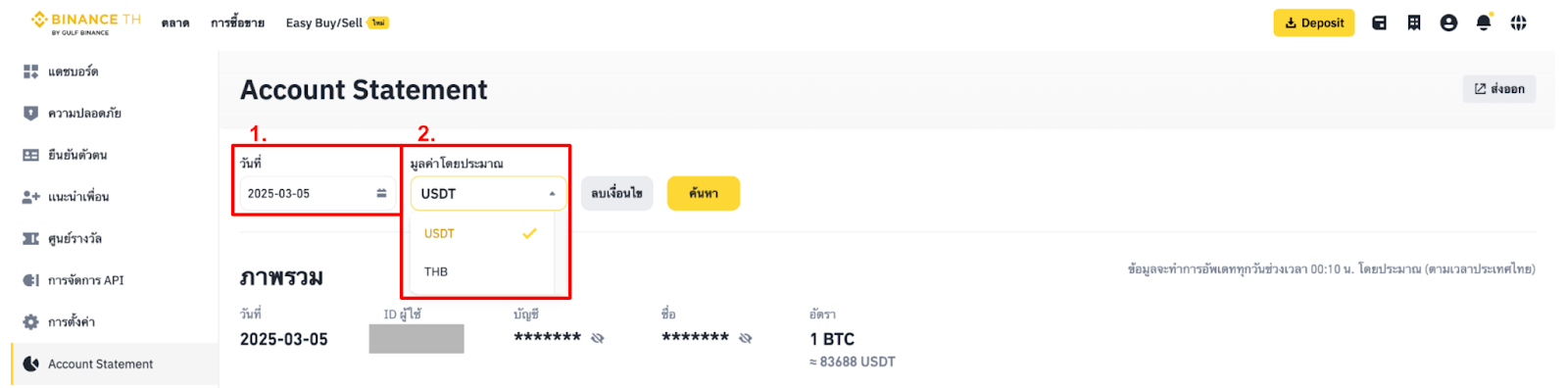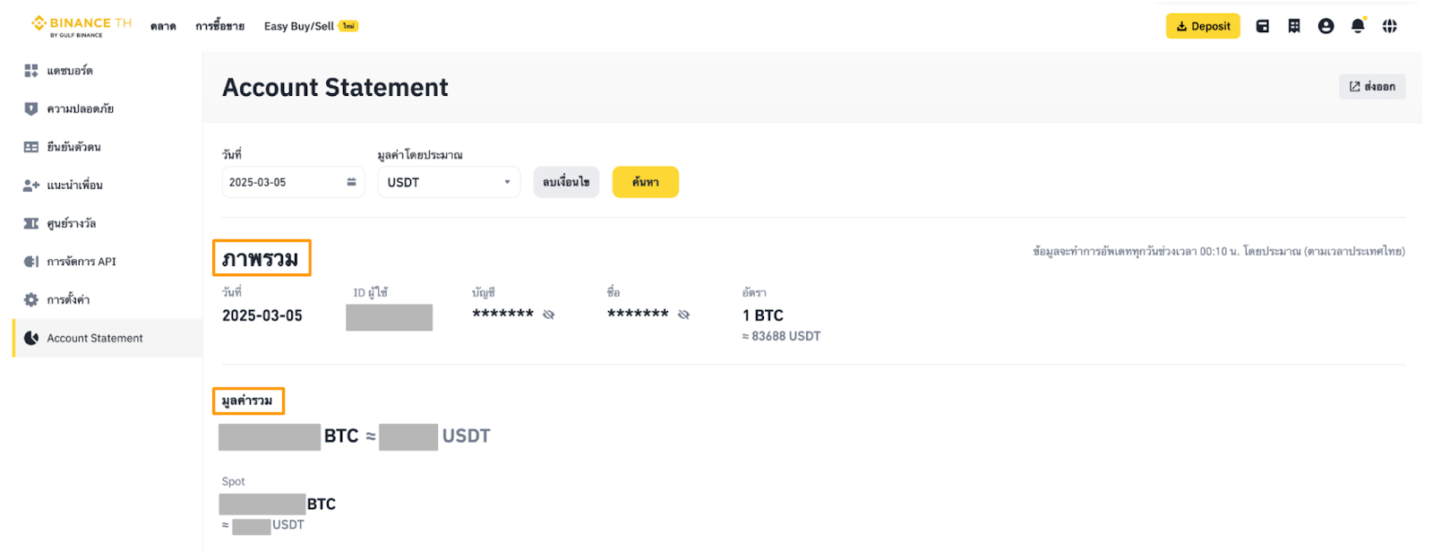 Account Statement จะแสดงภาพรวมของบัญชีสำหรับวันที่ที่เลือก, รหัสผู้ใช้, บัญชี, ชื่อ-นามสกุล, อัตราแลกเปลี่ยน, และมูลค่ารวมในหน่วย BTC และสกุลเงินที่คุณเลือก นอกจากนี้ยังสามารถดูยอดคงเหลือของสินทรัพย์ในกระเป๋าของคุณได้