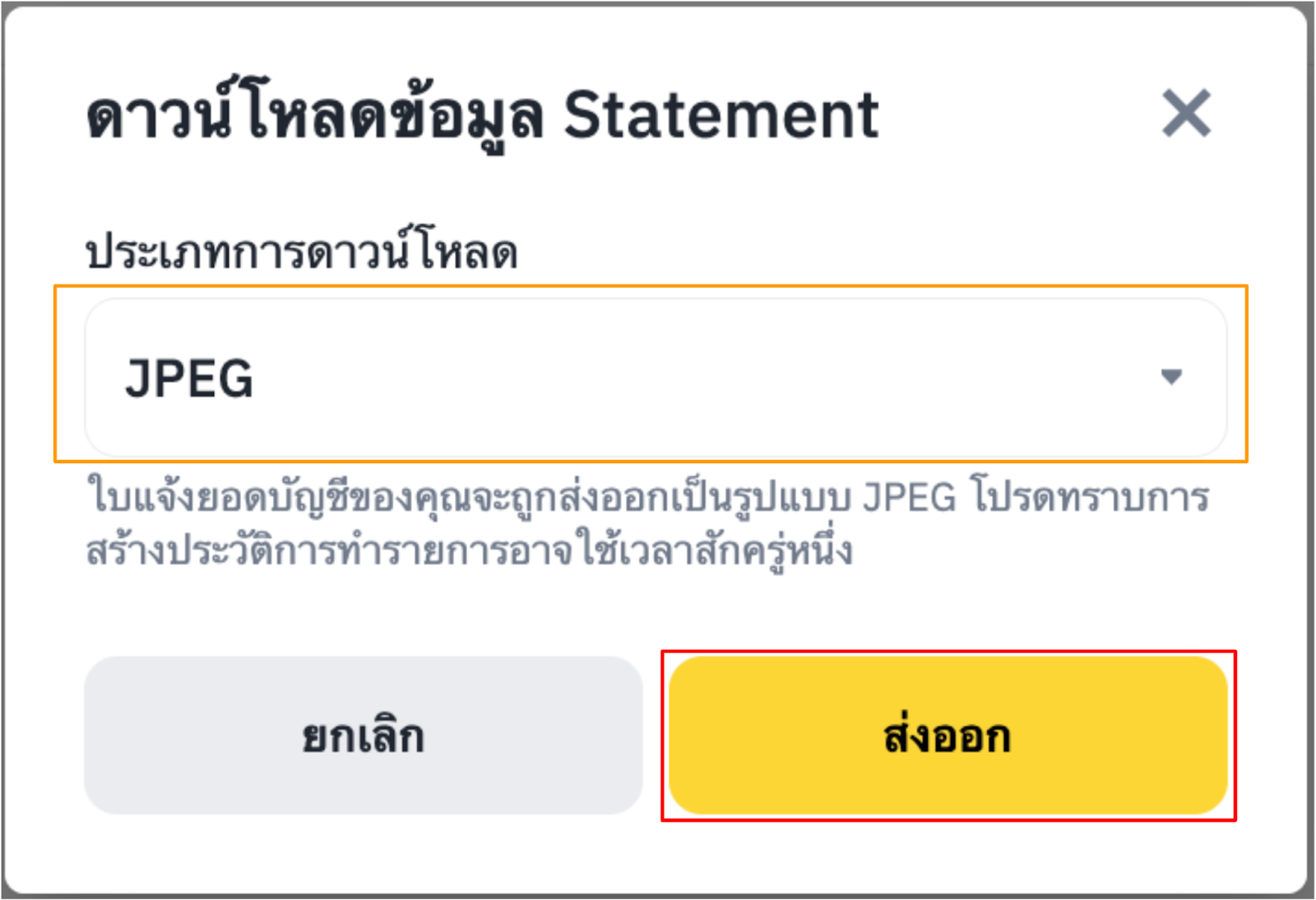 คุณสามารถบันทึก Account Statement เป็นภาพ โดยเลือกประเภทการดาวน์โหลดเป็น ‘JPEG’ แล้วคลิกที่ [ส่งออก]