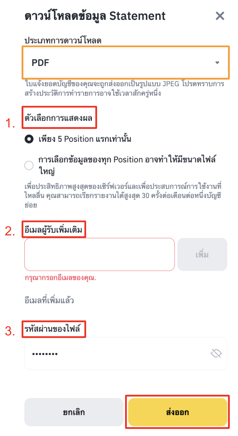 คุณสามารถส่งออก Account Statement เป็นไฟล์ PDF โดยส่งไปยังอีเมลที่ลงทะเบียนของคุณหรืออีเมลของบุคคลที่สาม หากคุณเลือกส่งออกข้อมูลเป็น PDF จะได้รับรายงานภาษาอังกฤษเท่านั้น ทั้งนี้คุณสามารถสร้าง Account Statement ได้สูงสุด 30 ครั้งต่อเดือน