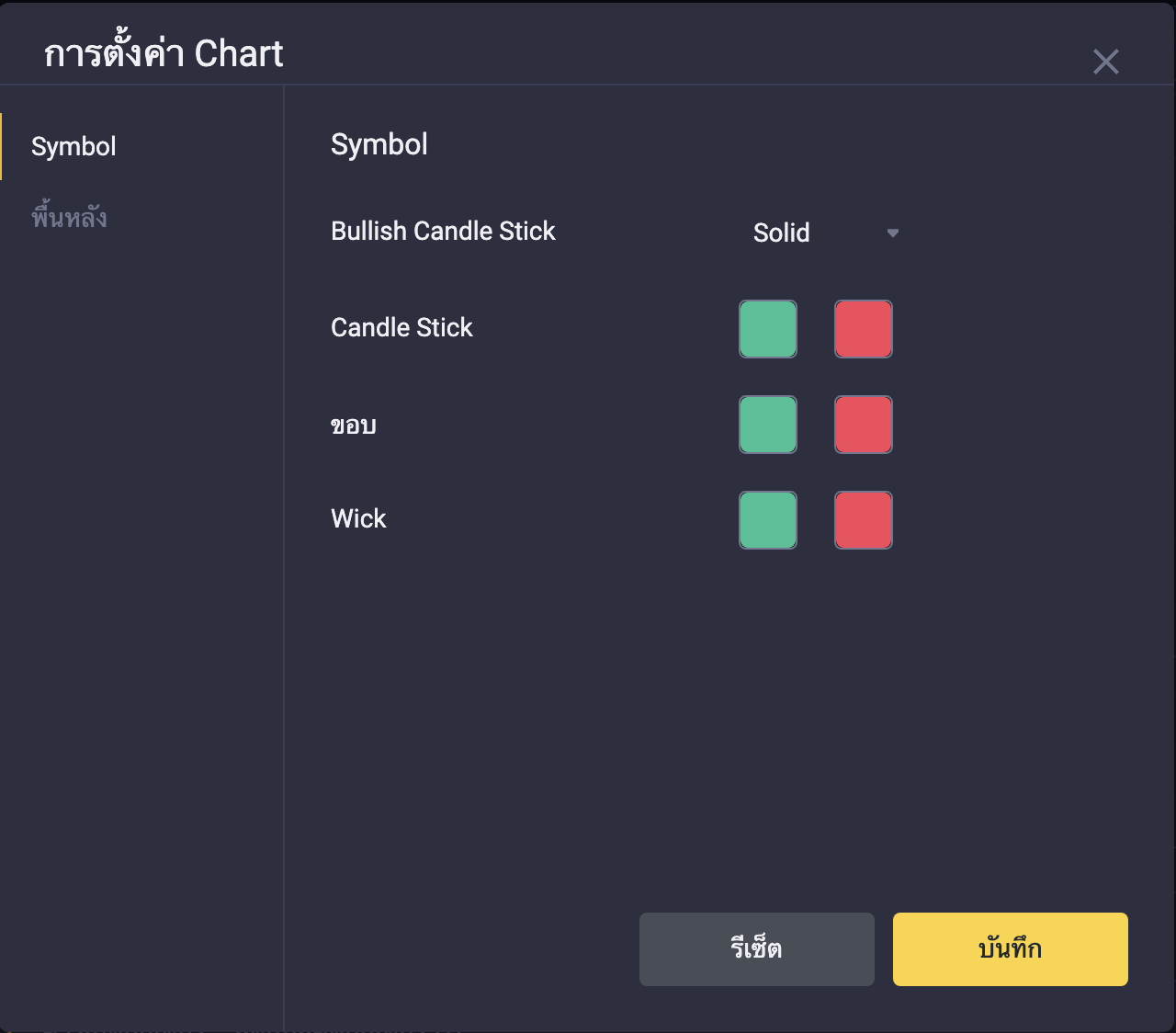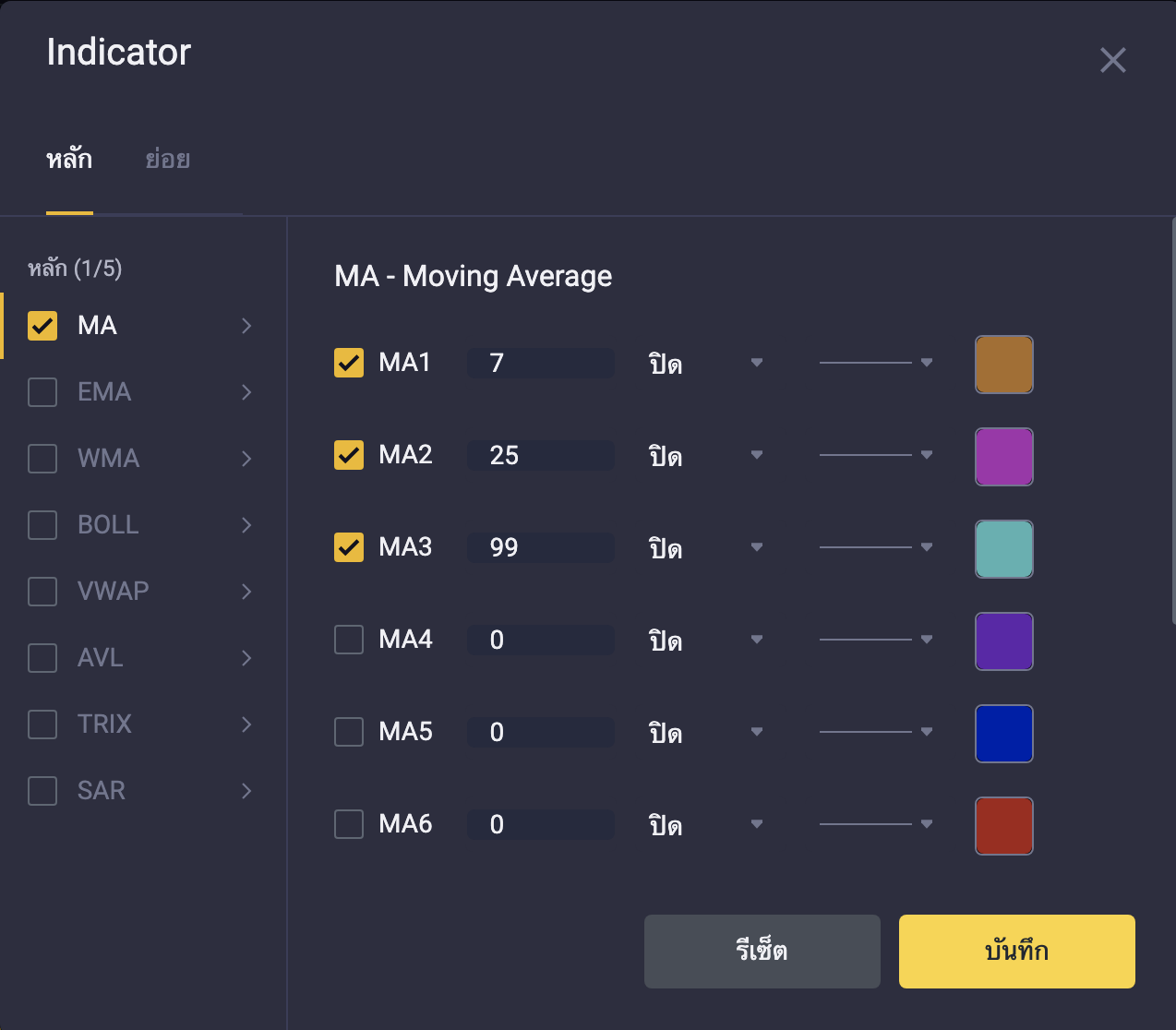 2. เลือกดัชนีที่จะแสดงบนแผนภูมิและปรับแต่งสี จากนั้นคลิก [บันทึก] หากต้องการคืนค่าเป็นสีเริ่มต้น คลิก [รีเซ็ต]