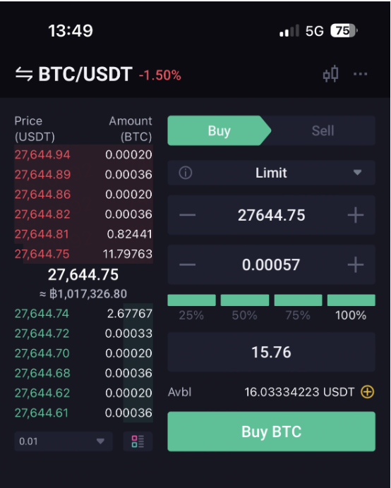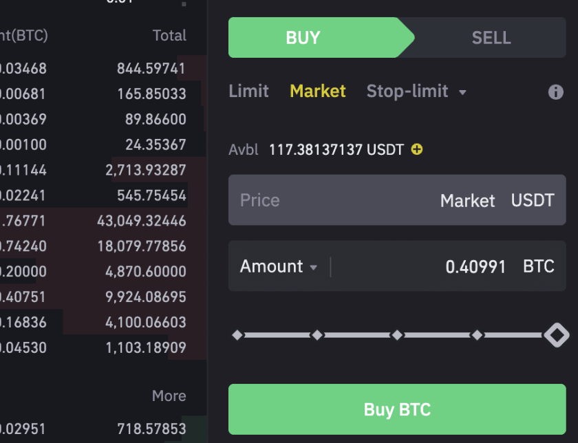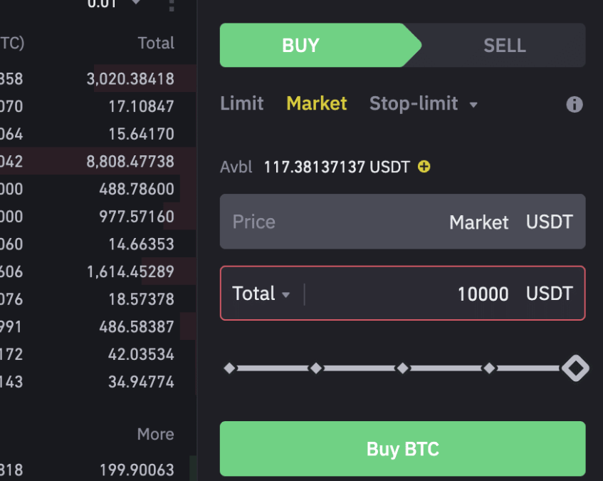 สมมติว่าคุณมีเหรียญจำนวน 10,000 USDT และราคาของคู่เหรียญ BTC/USDT มีความผันผวนประมาณ 23,310.94 USDT เมื่อคุณส่งคำสั่งซื้อทั้งจำนวน ระบบจะจับคู่คำสั่งซื้อของคุณกับคำสั่งขายที่ราคาดีที่สุดในตลาด ณ ขณะนั้นเพื่อกำหนดจำนวน BTC ที่คุณสามารถซื้อได้