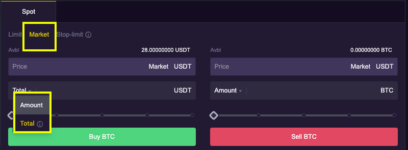 คำสั่งซื้อขายแบบ Market Order เป็นการส่งคำสั่งซื้อหรือขายที่กำหนดให้มีการจับคู่คำสั่งทันที ณ ราคาที่ดีที่สุด ณ ขณะนั้น เมื่อคุณต้องการส่งคำสั่งซื้อหรือขายสามารถเลือก [จำนวนเหรียญ,Amount] หรือ [จำนวนเงินที่ต้องการลงทุนรวม,Total] ได้ ตัวอย่าง เมื่อคุณต้องการซื้อหรือขายเหรียญ BTC ด้วยปริมาณที่แน่นอน ทางเราแนะนำให้ส่งคำสั่งด้วย [จำนวน,Amount] แต่ถ้าหากคุณต้องการซื้อเหรียญ BTC ด้วยเงินทุนจำนวนหนึ่งเช่น 10,000 USDT ควรส่งคำสั่งซื้อด้วย [จำนวนเงินที่ต้องการลงทุนรวม, Total] เป็นต้น