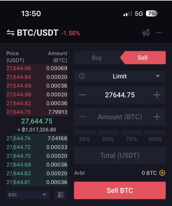 หรือลากแถบเหนือ [รวม] เพื่อกำหนดเปอร์เซ็นต์ของ BTC ที่จะขาย ตัวอย่างเช่น คุณมีเหรียญ 0.41045 BTC และต้องการขายทั้งหมด ให้ลากแถบไปที่ 100% และระบบจะคำนวณจำนวน USDT ที่คุณจะได้รับโดยอัตโนมัติ