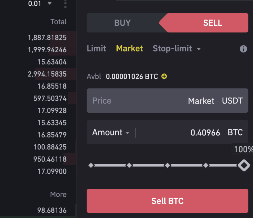 สมมติว่า คุณมีเหรียญจำนวน 0.40966 BTC และราคาของ BTC/USDT มีความผันผวนประมาณ 23310.94 USDT เมื่อคุณส่งคำสั่งขายทั้งจำนวน ระบบจะจับคู่คำสั่งขายของคุณกับคำสั่งซื้อที่ราคาดีที่สุดในตลาด ณ ขณะนั้นเพื่อกำหนดจำนวน USDT ที่คุณจะได้รับ