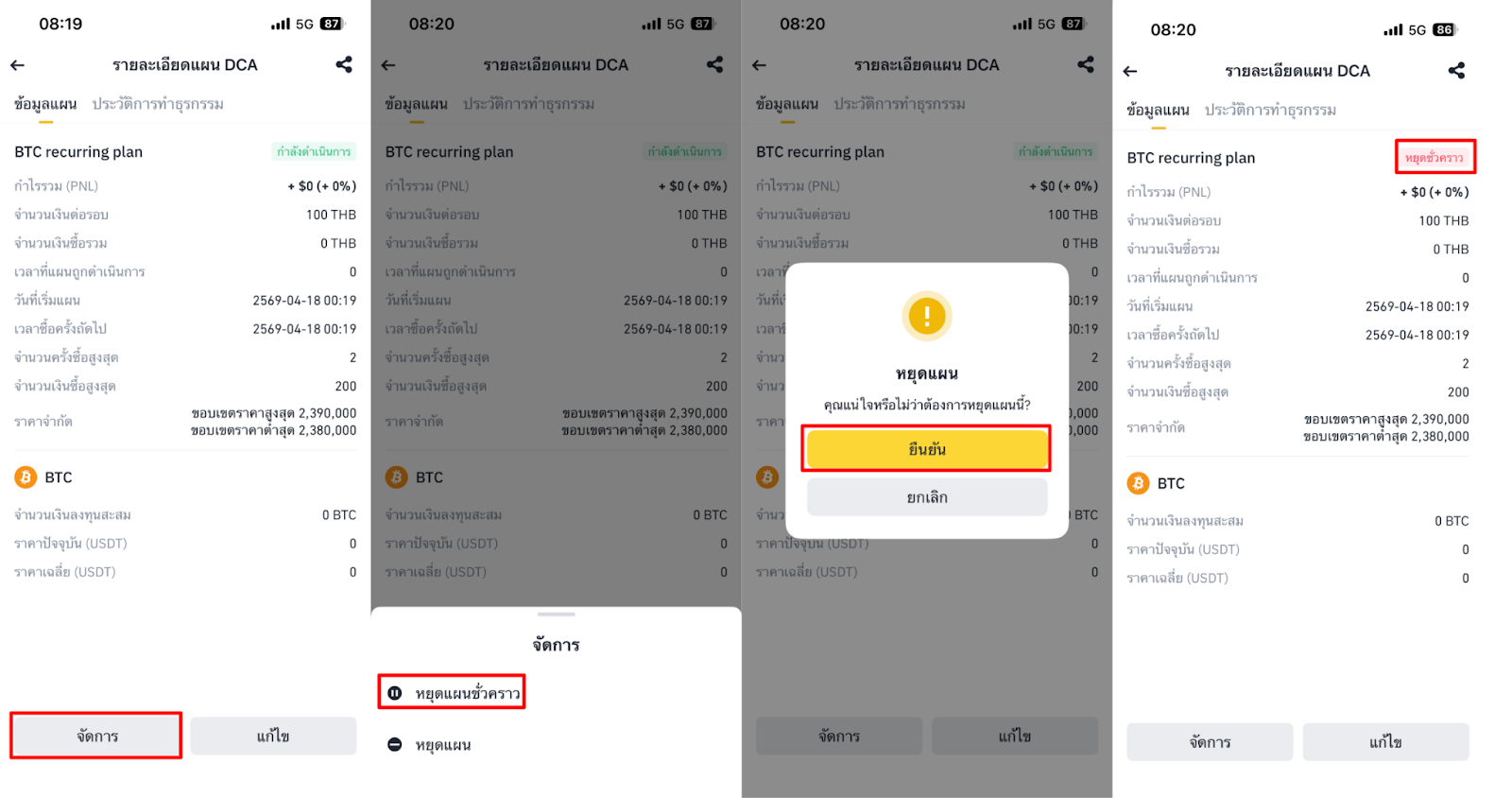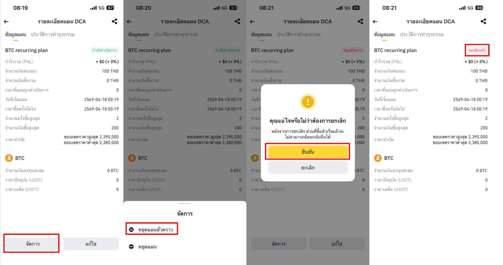 หากต้องการหยุดแผนแบบถาวร ให้ไปที่แผนที่คุณต้องการยกเลิกและไปที่ [จัดการ] เลือก [หยุดแผน] จากนั้นแตะ [ยืนยัน] เมื่อยุติแล้ว สถานะแผนจะเปลี่ยนเป็น “ยกเลิกแล้ว” และแผนจะไม่แสดงในรายการแผน DCA อีกต่อไป